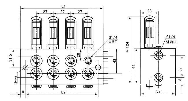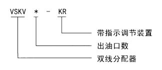VSKV-KR型双线分配器正面设上下二排出油口,分配器活塞正反向动作时分别从上排和下排的出油口排出润滑脂。还可以从指示杆的动作直接观察分配器的工作情况,并可通过调整螺钉在规定范围内调整出油口的给油量。