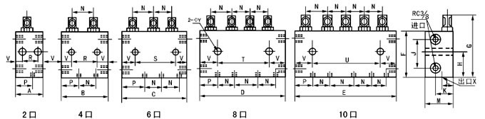 4、在分配器上下对应出油口间设有合二为一的出油结构,易改奇数出油,使用时只需将孔内的螺钉拧出,把上或下不用的那个出口用R1/4 螺塞封堵即可。