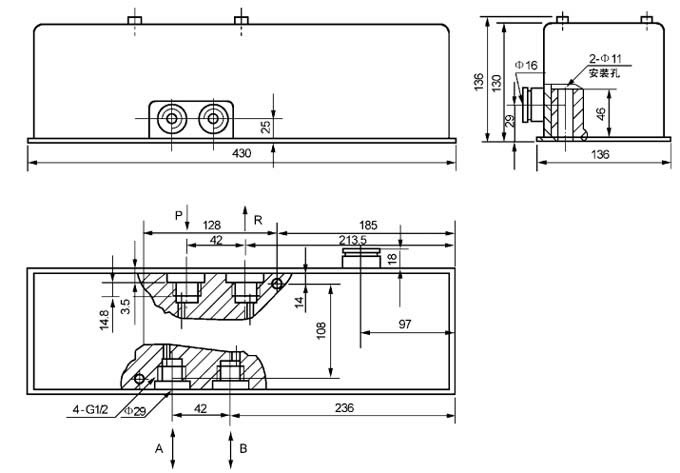 2、当作二位二通使用时,须把出油口“B”和回油口“R”封堵。