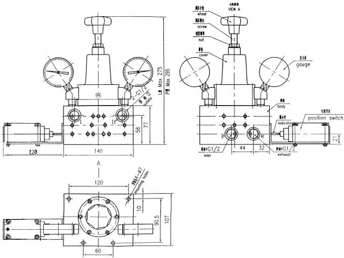 二、功能和结构说明 本阀为二位四通自动液压换向阀,上平面设有两块压力表和调压手轮。换向压力由手轮调节,顺时针压力升高,反之压力降低。本阀门进油口P与泵出油口连接,回油口R接贮油桶,供油口Ⅰ、Ⅱ分别与两条供油管路连接。工作时当Ⅰ路油压达设定压力,换向阀自动切换到Ⅱ路,这样润滑泵就能循环往复地向两条管路供送润滑脂。 三、技术参数