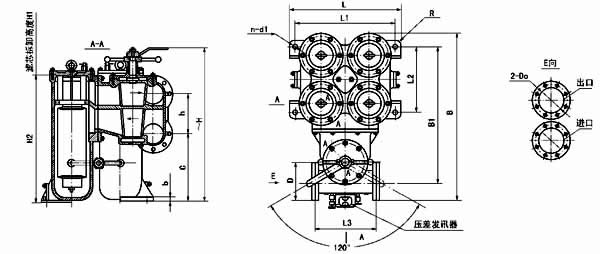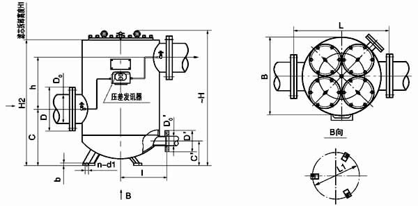 法兰标准:GB573-65(可根据需要确定):DN100、150-3 组滤芯组件 DN200-4 组滤芯组件;压差发讯器为选配件。