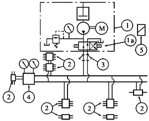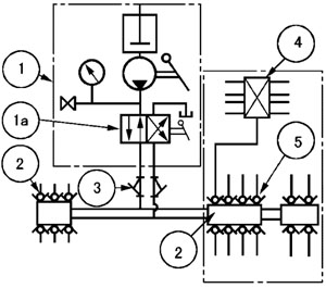 由换向阀 1a 的位置决定润滑泵①输出的润滑剂经两条供油主管的某一条供送,另一条向贮油器开放。