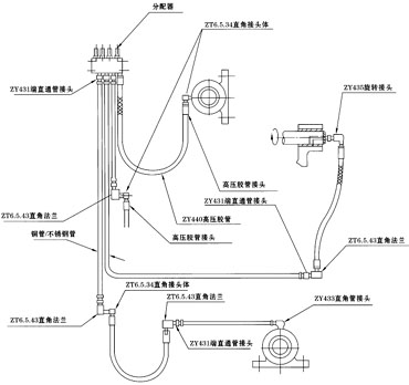 润滑点可以有固定、移动、旋转三种不同类型,其配管方法各异。对于固定不动的部件,一般工作场合的配管主要使用铜管,特殊场合则使用不锈钢管,分配器出口侧采用端直通管接头,轴承侧应使用直角管接头或端直通管接头。
