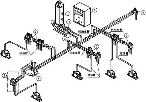 基本动作和前述电动终端式系统相同。二次分配由双线分配器②的出油口接二次供油管向递进式分配器③供油,这样,双线式分配器的一个出油口可向4~8个润滑点给油。