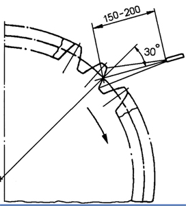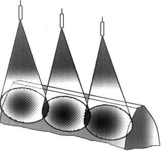 在对开式齿轮进行喷射润滑时,应把润滑剂喷射在驱动小齿轮的受负荷的齿面上,这样,当驱动小齿轮和大齿轮啮合时,会把润滑剂带到大齿轮的每个啮合面上。喷嘴安装时,要注意喷嘴的安装角度以及与被润滑面之间的距离,如图24所示。如齿面较宽,可把多个喷嘴并排安装在一起,两个相邻的喷嘴所喷射在齿面上的区域应有一小部分重叠,确保在齿面上没有润滑剂的喷射盲区(见图25)。由于采用了单质喷嘴,因此能对齿面进行连续喷射,而不是象双质喷嘴那样的瞬间断续喷射,所以能确保每一个齿面都能复盖一层均匀的精细的润滑剂。