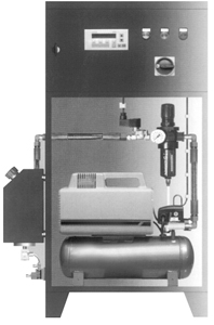 行车轨道润滑装置(见图26)由上下两部分组成,上面部分是PLC电气控制部分,下面部分由气动泵、小型空气压缩机和压缩空气处理部分、油气混合块以及Jetsplit油气分配器等组成。考虑到行车的移动距离大,从现场的压缩空气网络引入气源困难,所以,本装置自带小型空气压缩机。