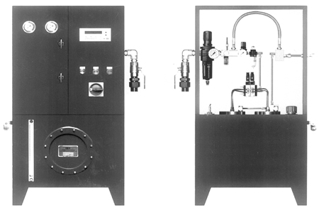 开式齿轮油气喷射润滑系统由油气喷射润滑装置和喷嘴组成。油气喷射润滑装置(见图23)分上中下三个部分。上面部分为PLC电气控制部分,中间部分为压缩空气处理和油气流分配及输出,下面部分由油箱、气动泵(一个工作、一个备用)和油气混合块组成。从位于油气喷射润滑装置右侧的油气出口供出的油气混合物通过喷嘴喷射到齿轮上。